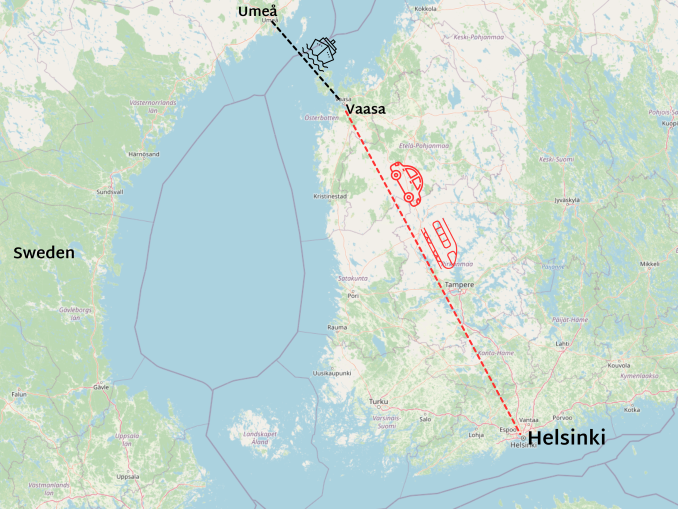 There is also ferry connections available to Turku, Finland and Vaasa, Finland. The distance from Turku to Helsinki is 172 kilometres and takes 2 hours by car. The distance from Vaasa to Helsinki is 425 kilometres and takes 5 hours 15 minutes hours by car.
